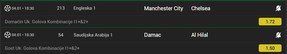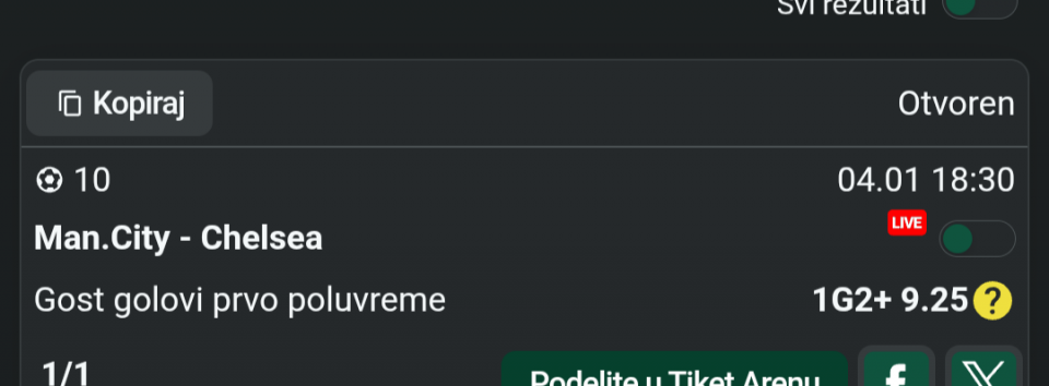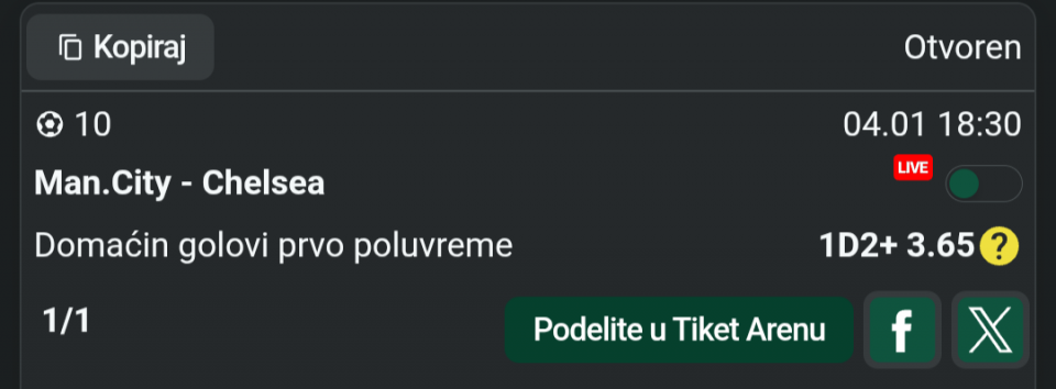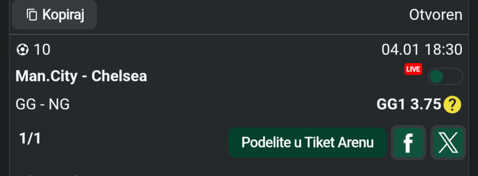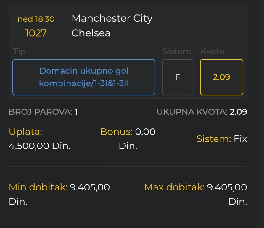 Danasnji tiket za sada ide lepo prvi par je prosao napoli 2+ i navijamo za dalje, ali reko da presecem sa necim sto me tera ceo dan da igram, pa ako me osecaj zafrkne jbg....
