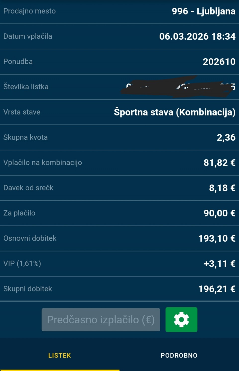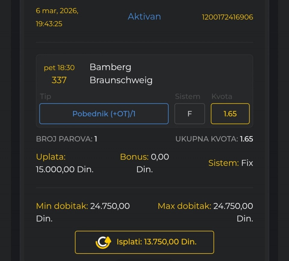 08.03.2026. 21:00h Dep. La Coruna - Granada; tip: X; kvota: 3.40; uplata: 1.440,00 din.; isplata: 4.896,00 din.