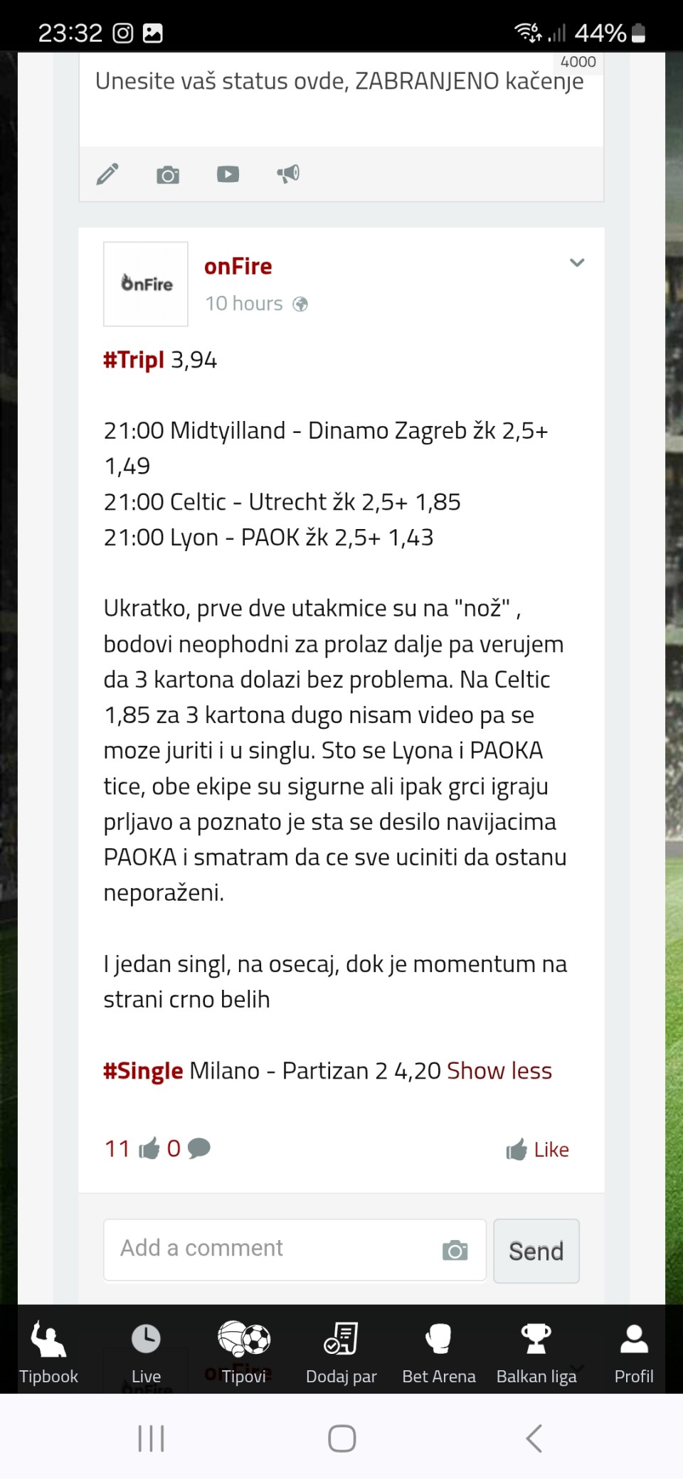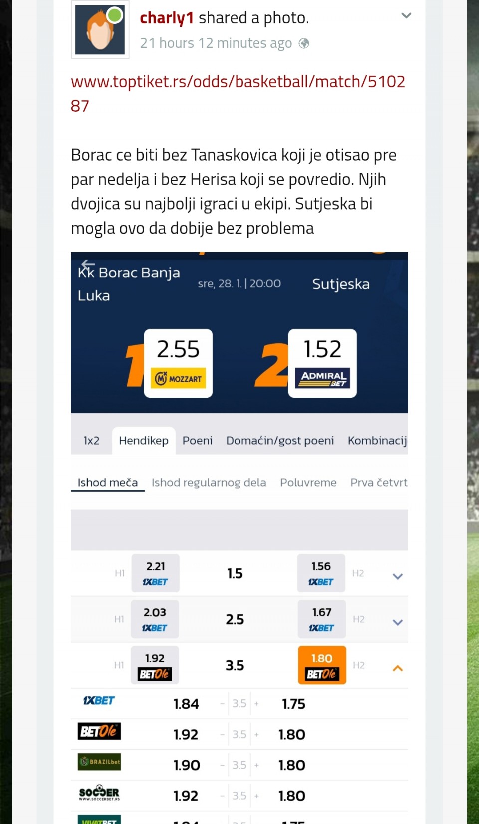 tip: over 2.5 (67 minut trenutni rezultat 1:1)