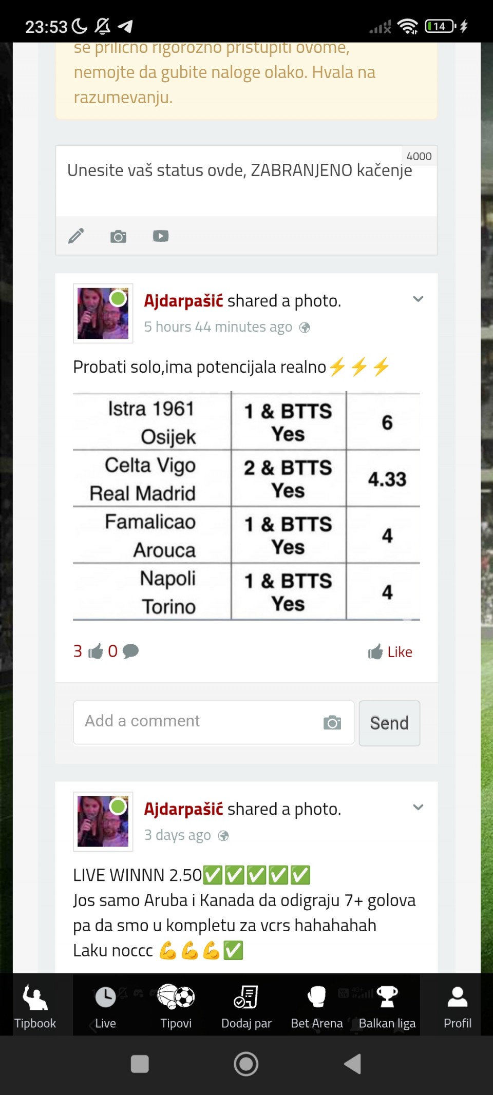 Skroz pri dnu nisam lepo slikao idu jos jedna 3 za 3 pobede domacina. Cini mi se da ide pobeda Lirsa 1(2,20) ko voli cudne utakmice!!!!