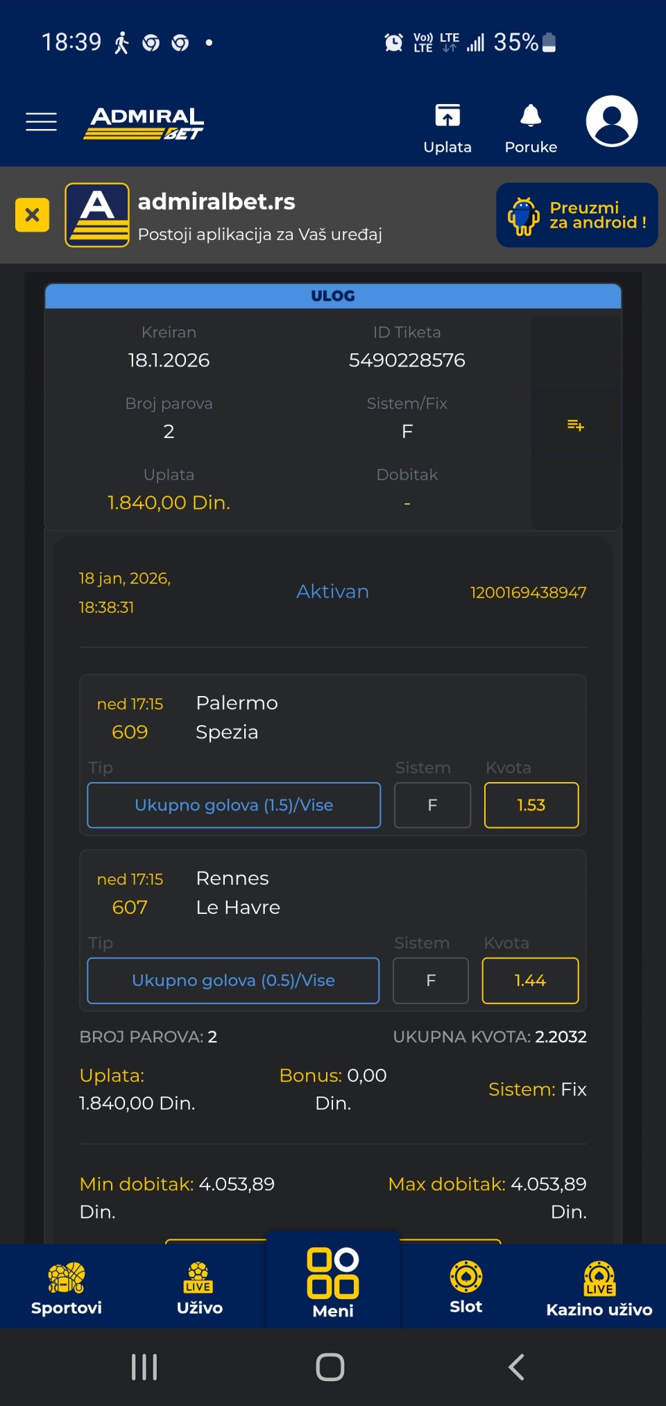 zbroj golova Marsenić Mijajlo (2.5) ISPOD KOEF 1,85-DAO 1