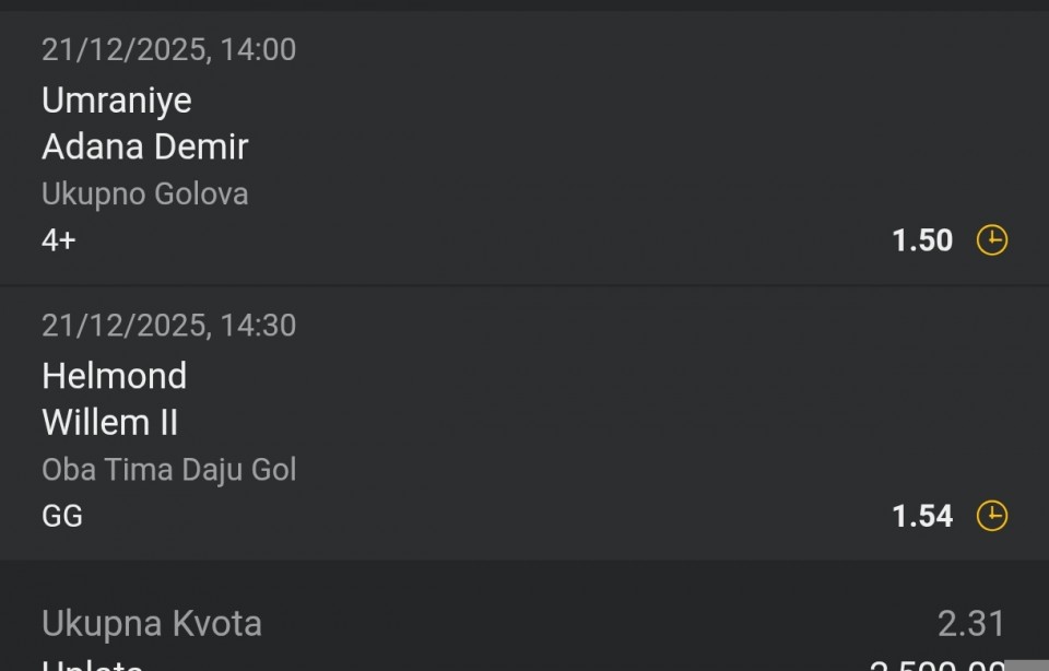 21.12.2025. 12:15h Den Bosch - Vitesse; tip: X; kvota: 3.90; uplata: 11.520,00 din.; isplata: 44.928,00 din.