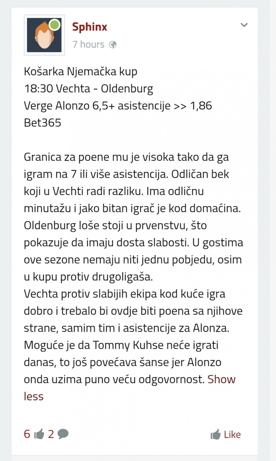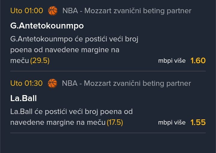 Ovo mi je copi paste tiket.. pre 2 dana ingram imao 2 slobodna za win jedno pogodio drguo omasio i stao na 19.. te veceri sam smanjio granu ali ne znam zasto sam se odlucio posle 20+.. sada kada je skola naucena ide na 18.5 pts.. chunighem je neko...Ovo mi je copi paste tiket.. pre 2 dana ingram imao 2 slobodna za win jedno pogodio drguo omasio i stao na 19.. te veceri sam smanjio granu ali ne znam zasto sam se odlucio posle 20+.. sada kada je skola naucena ide na 18.5 pts.. chunighem je neko me postuje u poslednje vreme i morao sam da odigram jel tompsona iz dala nije bili u ponudi da igram na asist ako ako se ponovi vece kada sam cekao ingrama imamo 95% da ovo pogodimo Show more