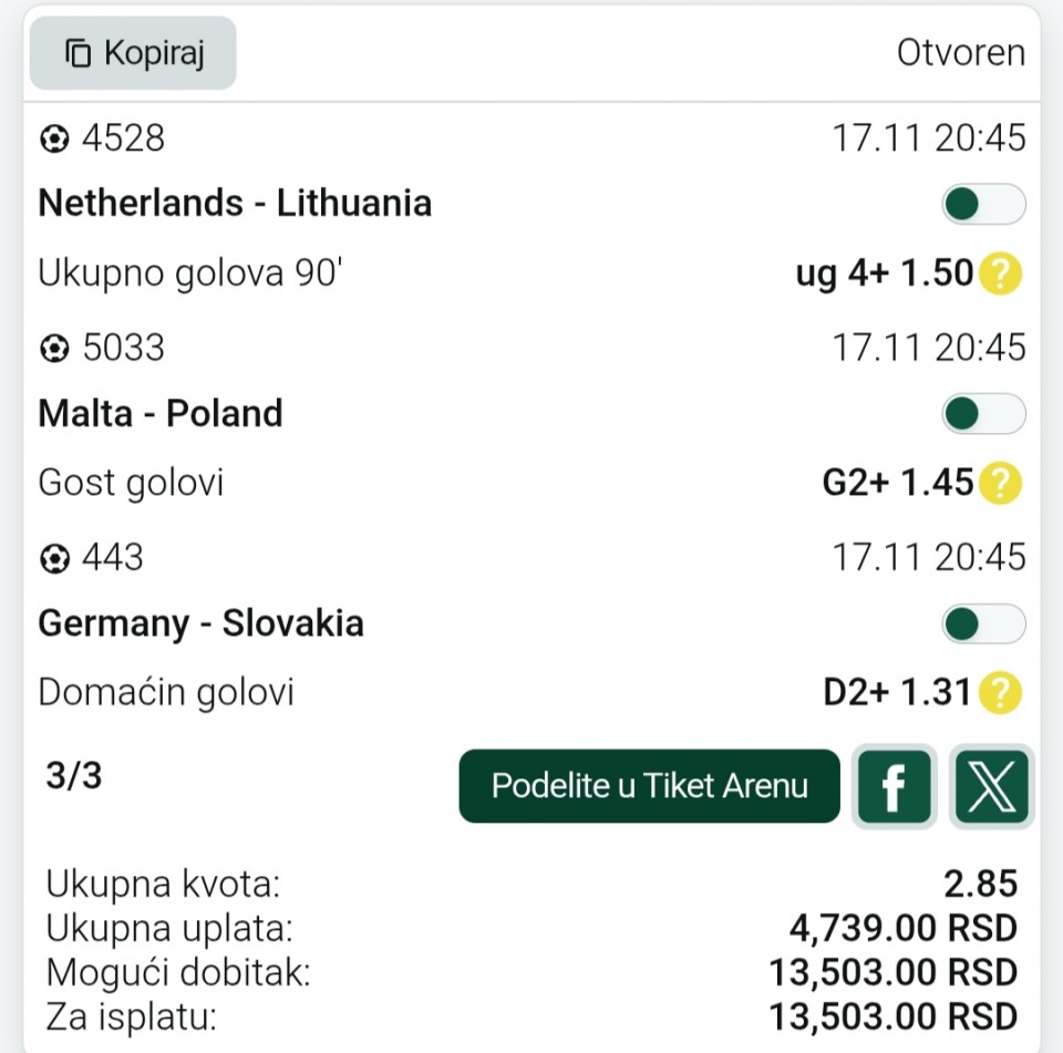 Istorija je pokazala da je Nemačka znala da kiksne protiv "manjih" reprezentacija kad je veoma bitno..Mislim da je Slovačka idealan tim da se tako nešto ponovi..Nemačka nikad nije izgledala nepouzdanije nego u ovom trenutku, mislim da je idealan trenutak za kiks..Ako su mogli u prvom meču da ih dobiju, zašto ne bi i sada..Glavni tip X2 (3.9), a kao bonus tip 2 (10)..