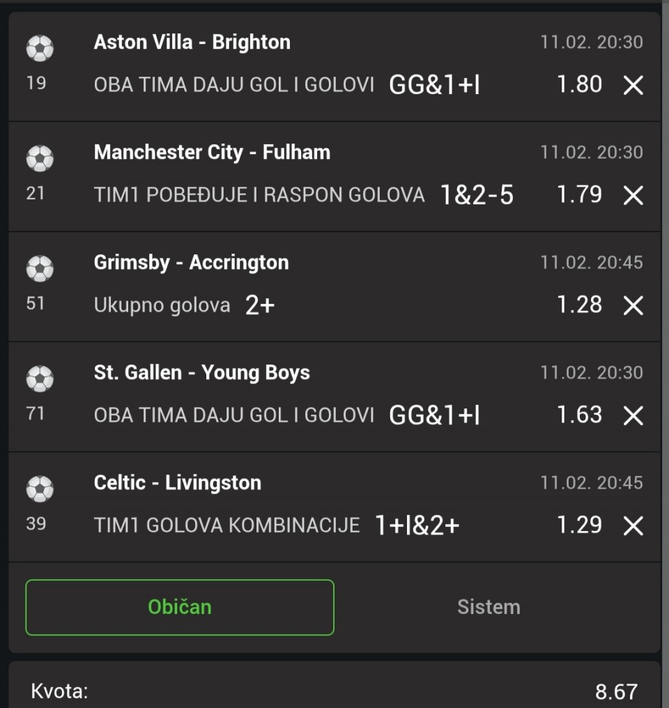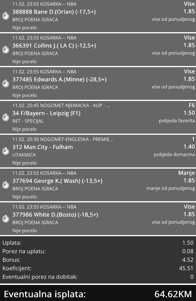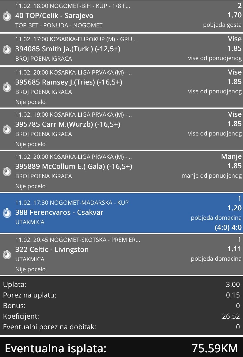 Od mene za danas ova dva tiketa, neke utakmice su počele, ali igrači su u fokusu svakako. Sretno ukoliko neko prepiše nešto🍀⛹️♂️.