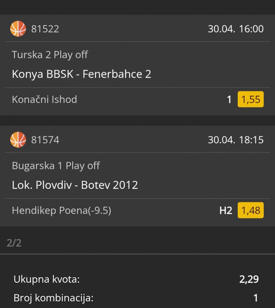 flako123 Cao brate, imam dvije molbe za tebe...prva je mozes li malo ranije da izbacas tikete jer bas volim sve da ispratim sto ti izbacis ali jbg nekad bude kasno i ne vidim....druga molba mozes li da izbacas po 5,6 igraca ili sto vise tipova koji ti se cine izgledni?Jbg znam da to nije lako pogoditi,ovako kad izdvojis singl,double itd obicno ti prodje a 5,6 je vec milion puta teze,ali i u slucaju promasaja msm da te niko nece osudjivati,ocigledno ih bolje osjetis nego prosjecan korisnik sajta...npr ja sam igrao 6 igraca prije neku noc sa 10e, aj 40 solidna kvota i solidan dobitak ali jbg samo 3 pogodio, tako da bi mi bilo milije tvojih 6 nego da ja mlatim na slijepo 5 hours 40 minutes ago
