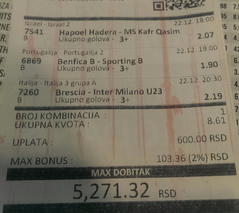 21.12.2025. 15:00h Sassuolo - Torino; tip: X; kvota: 3.15; uplata: 360,00 din.; isplata: 1.134,00 din.