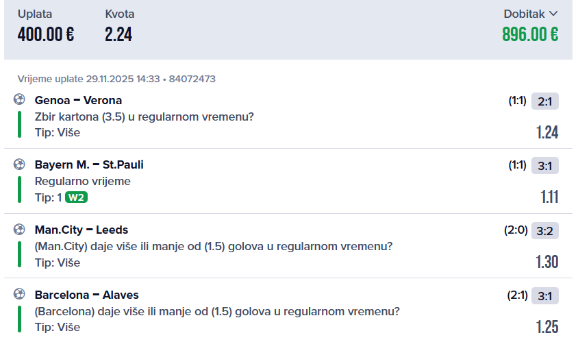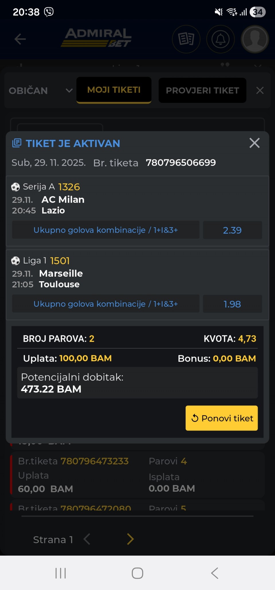 Veštačka inteligencija kaže ovako.do duše rekla Milan 2-3, Marsej 1&D2+ i atletiko h1 a ja sam modifikovao pa videćemo...