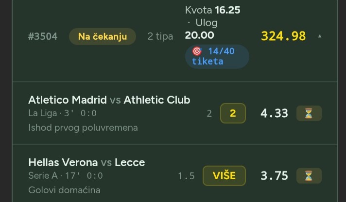 Juče sam krenuo sa ovim sistemom klađenja, tiketi su 2/2, lep profit sam ostvario.