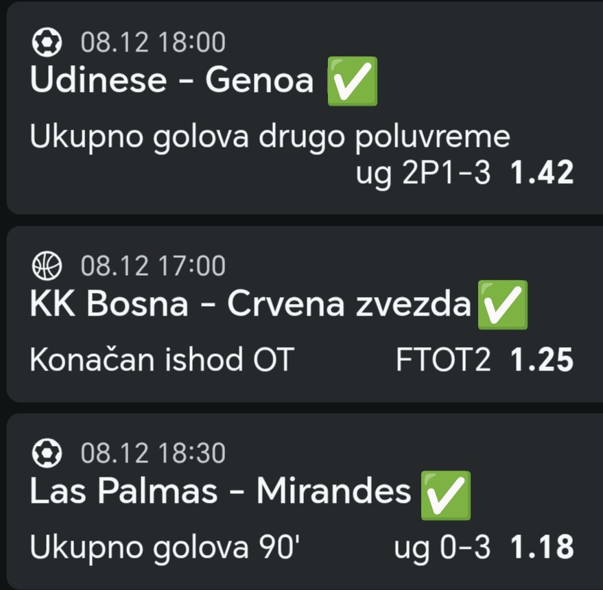 Dvoumio sam se izmedju Osasune i Mancestera i na kraju razum kaze Osasuna. Ne verujem Unitedu, iako su Wolvesi blago receno uzasni i vec su sad mislima u Championshipu. Englezi su spaljeni, tu nema pravila a Manco je danas broj 1 vecini na tiketu...Dvoumio sam se izmedju Osasune i Mancestera i na kraju razum kaze Osasuna. Ne verujem Unitedu, iako su Wolvesi blago receno uzasni i vec su sad mislima u Championshipu. Englezi su spaljeni, tu nema pravila a Manco je danas broj 1 vecini na tiketu. Ovamo Osasuna nije nista specijalno ali ipak igra na domacem terenu protiv zadnjeg Levantea pa verujem da mogu iscupati 3 boda i malo skociti na tabeli. Vrlo su neefikasni pa ocekujem veoma dosadan mec i barem taj pobedonosni gol Osasune. Srecno!
