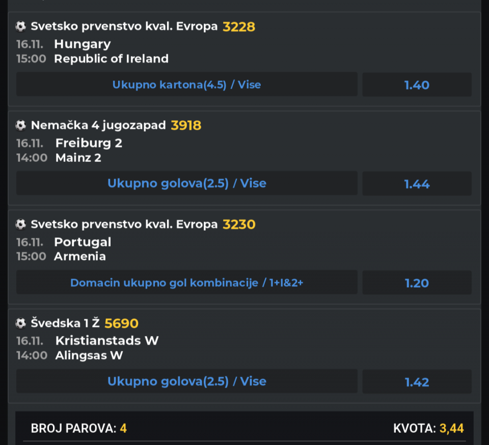 lično do sada najbolji profit jer sam duplao dva puta na šestom koraku i to baš prošao kvotu 2.75 i juče kvotu 2.12, a bio sam baš siguran da cu skinuti 2.48 kvotu na petom koraku za još bolji profit, al prodadoše me slovaci, pa sam morao još jedan korak, fudbal je to, zadovoljan sam hvala bogu