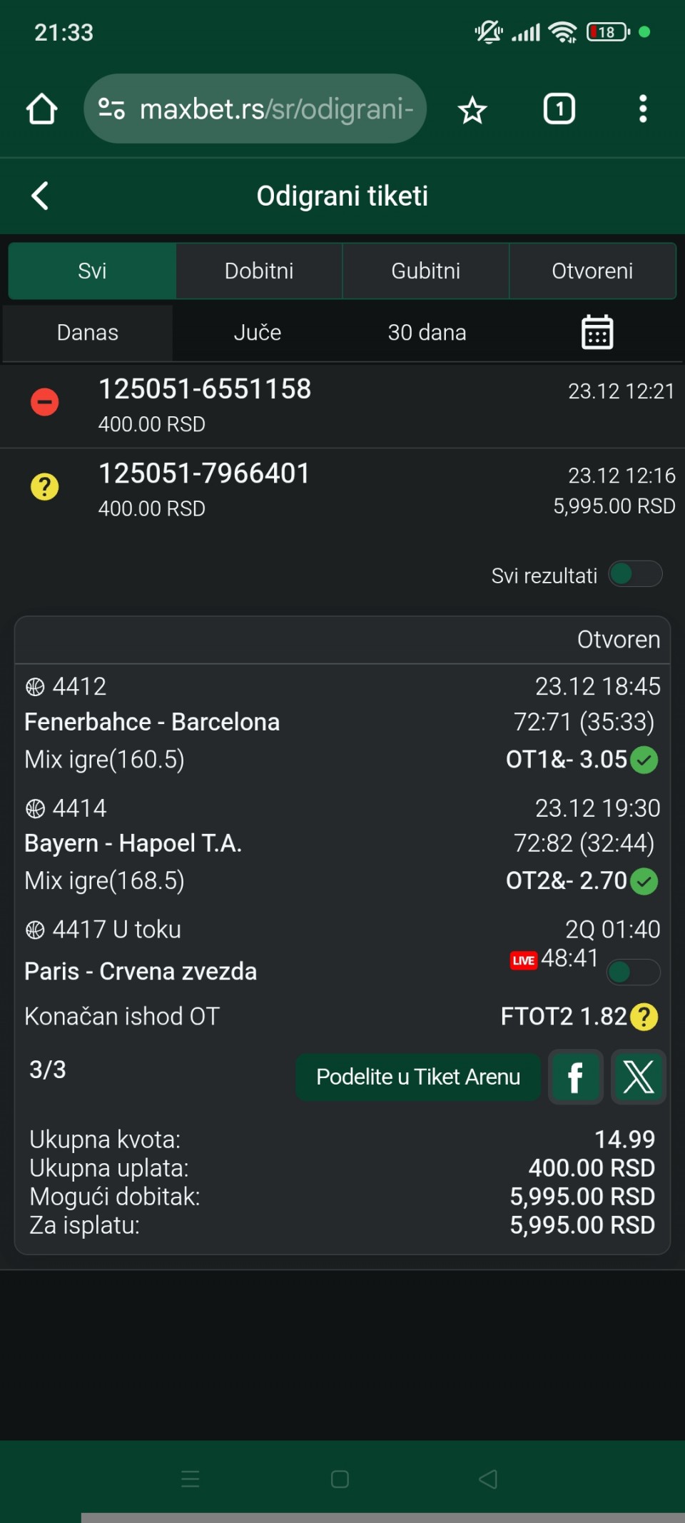Live DA probam Popravni za Nigeriju, Tunis 2,5+ 1,40 ..Poluvreme Domaćin. vodi 2-0 , može da se proba D2,5+ 1 75 .Ja sam za prvi predlog,ko hoće može da proba i dr. Predlog.Manji ulog.Sretno ko prati Maxbet