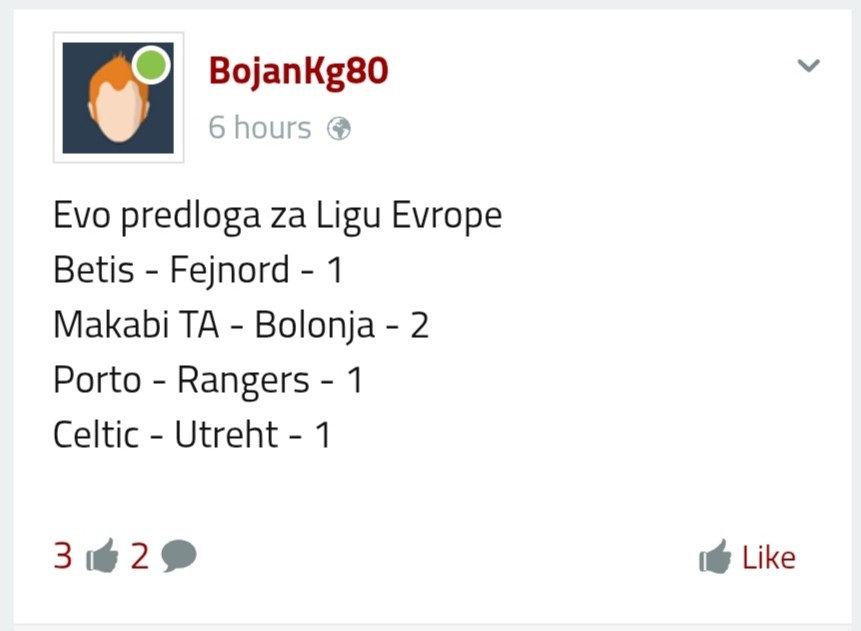 Nekako mi je za veceras Real dvojka, kod mene kvota 1.80, uklopio sam marsej dvojku na 2.40 i kec na Man. Siti ukupna kvota oko 5 i lepa uplata od 2000 dinara.