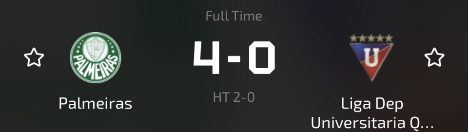 Palmeirasu je potrebno da postigne 3 gola, kako bi nadoknadio rezultat iz prvog meca. LDU se nada da po 3. put izbaci jos jedan Brazilski tim. Prvo su izbacili Botafogo, pa zatim Sao Paulo.
