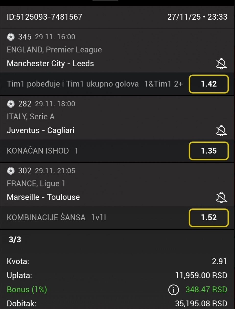 29.11.2025. 18:30h Albacete - Dep. La Coruna; tip: X; kvota: 3.40; uplata: 180,00 din.; isplata: 612,00 din.
