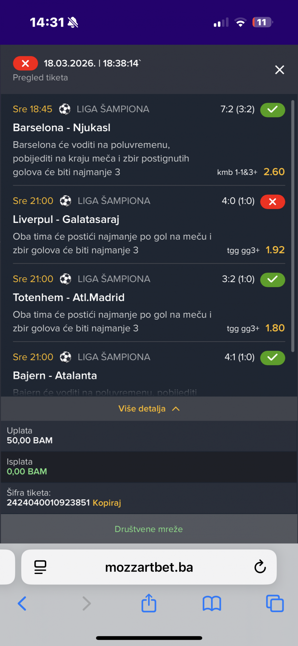 Dobitak. 38,50...Odb. Fenerbahce W-Skandici W 1 (1,25)