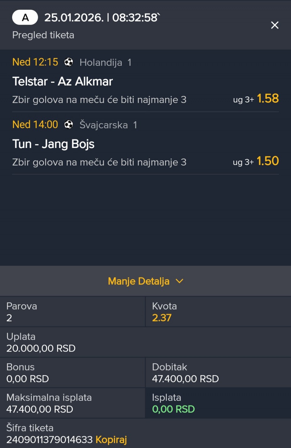 24.01.2026. 15:00h Como - Torino; tip: X; kvota: 4.15; uplata: 15.000,00 din.; isplata: 62.250,00 din.