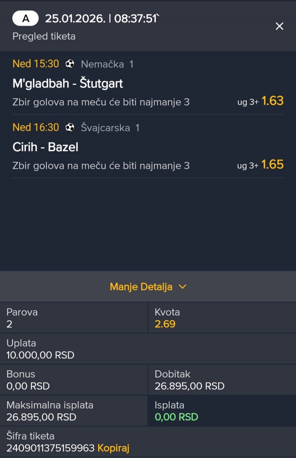 24.01.2026. 15:30h Heidenheim - RB Leipzig; tip: X; kvota: 4.60; uplata: 180,00 din.; isplata: 828,00 din.