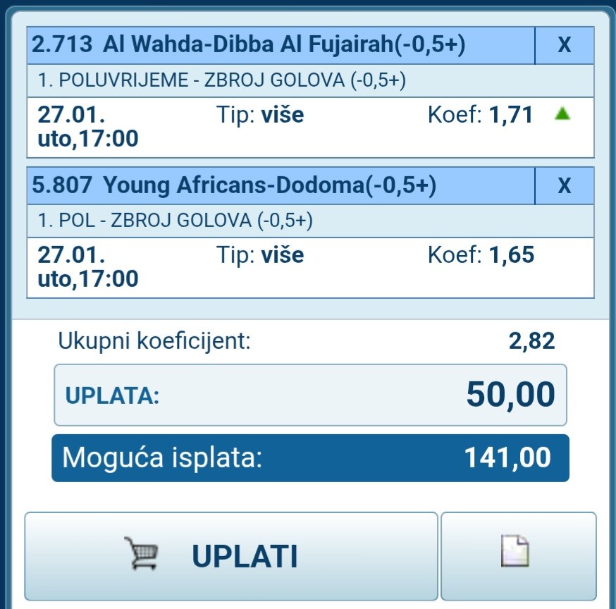 27.01.2026. 20:30h St. Pauli - RB Leipzig; tip: X; kvota: 3.65; uplata: 360,00 din.; isplata: 1.314,00 din.