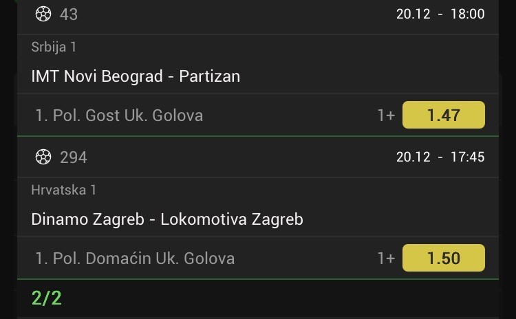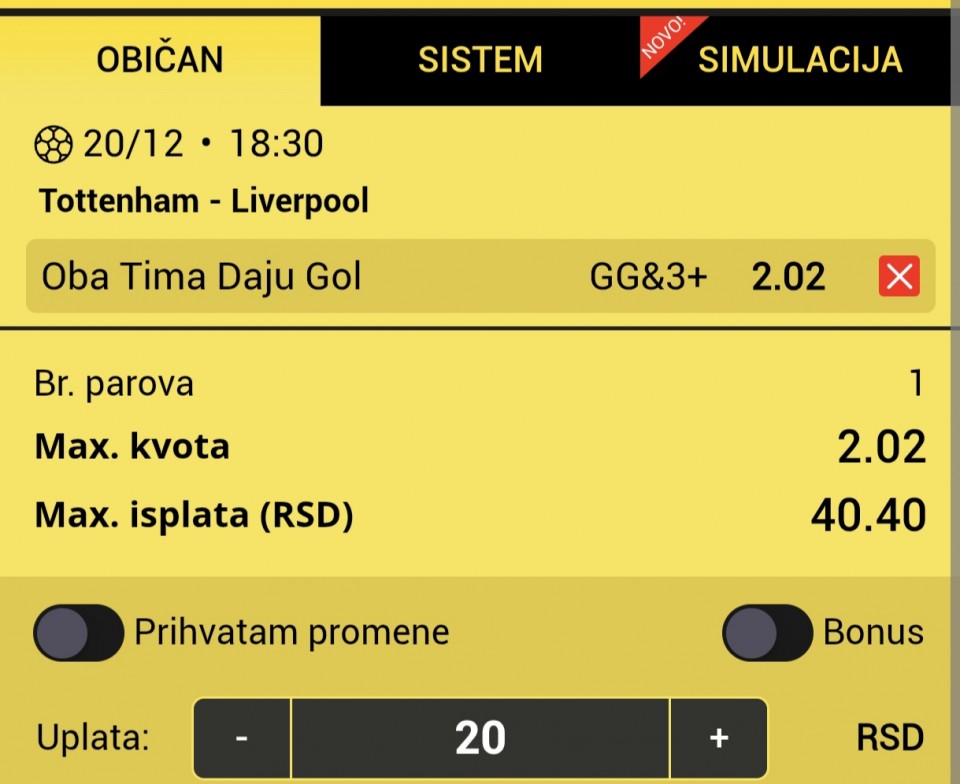 20.12.2025. 21:00h Leeds - Crystal Palace; tip: X; kvota: 3.10; uplata: 360,00 din.; isplata: 1.116,00 din.
