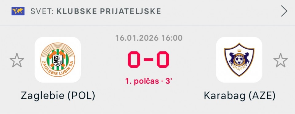 Razlog: 1 postava karabaqa i poslednja prijateljska utakmoica prije lige sampiona. Za 5 dana igraju sa eintrachtom. Najjaca postava kod gostiju.Zaglebie sa druge strane pocela sa pripremama imajo i sutra utwkmcio...LIVE: