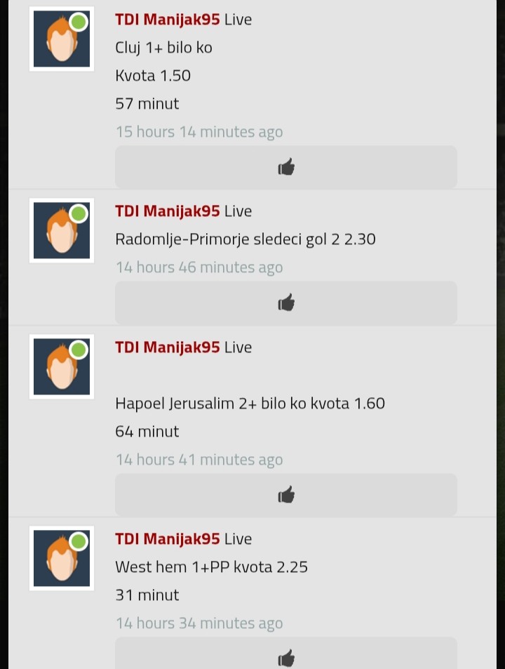 Juce je stvarno bio dobar dan, dosta Engleza je doslo sto se tice golova bas super dan, ali eto ja sam neke izbacio nize lige, onda ubacio neke druge gluposti sve u svemu 14 od 19 pogodjenih, ali najveci promasaji definitvno Real i Galata
