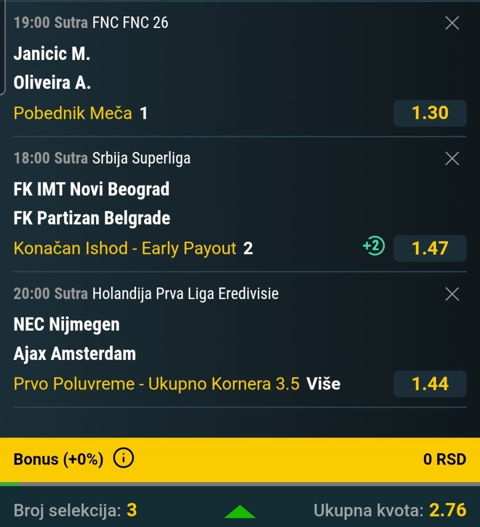 20.12.2025. 16:00h Torino - Cremonese; tip: X; kvota: 3.10; uplata: 360,00 din.; isplata: 1.116,00 din.