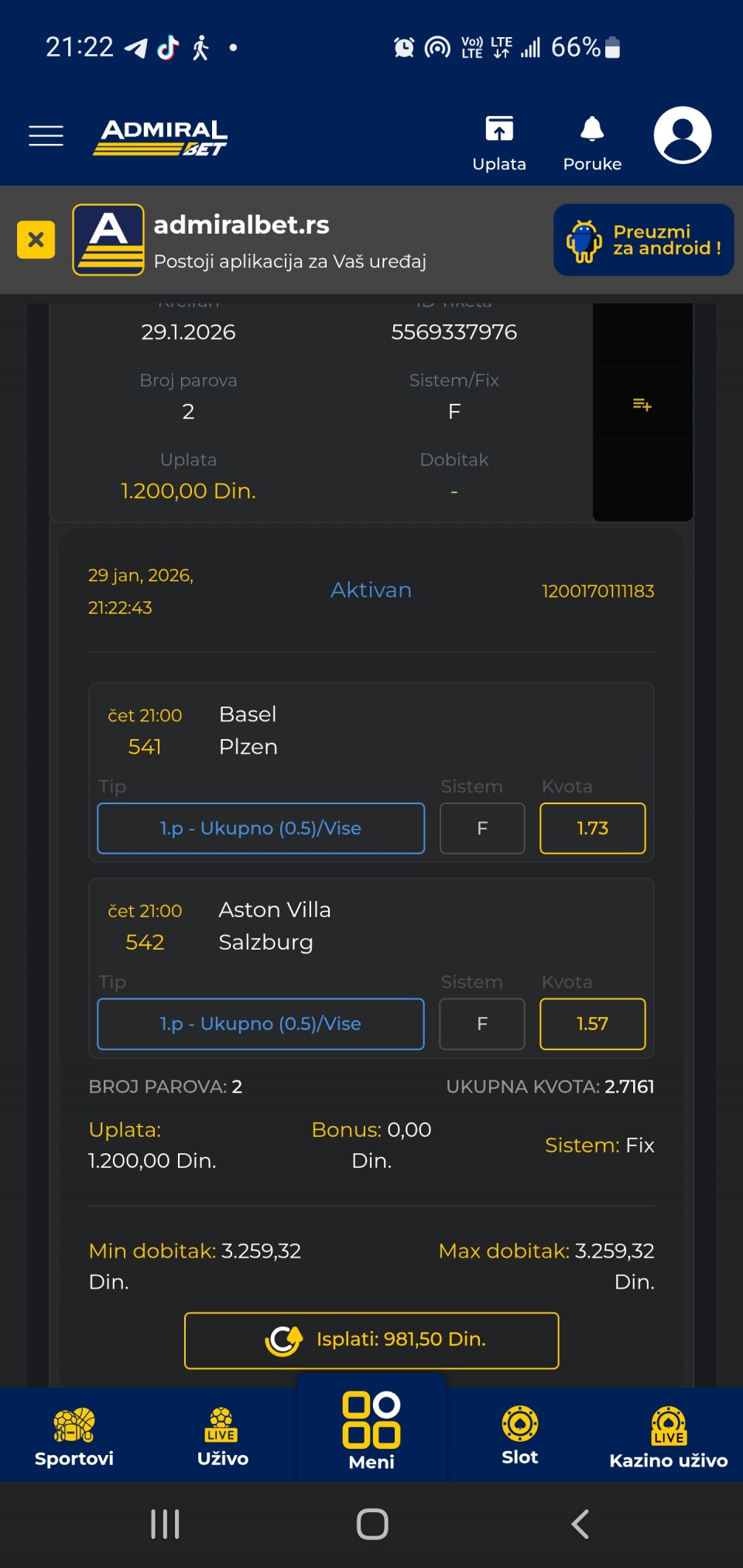 🇦🇺 Adelaide United - Macarthur II 2+ (1.73), na manji ulog 2-1 (24.50), ili 1-2 (24.50), oba prelaza u korist Macarthura na ovom stadionu, ko se seća oba puta smo ih skinuli prelaz, nadam se da će tako i sutra biti, srećno!