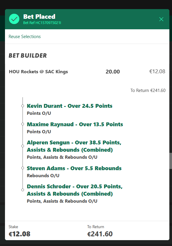 Generalno prolaz ove linije za njega ove sezone uzasan, 2/21, ali zasto birram njega veceras? Neki od razloga su sledeci, u prvom mecu protiv Nets imao je za 14min 7 suta uzeta i stao na 6 poena, dok u poslednjih 5 meca belezi 23,24 min u proseku dakle znacajan porast u minutima sto nam odgovara, a takodje 42% njegovih poena dolaze iz tranzicija, i 30% iz Spot Up suteva dakle 72% njegovih poena dolaze iz pozicija koje bruklin lose brani odnosno nacina suteva (29 i 30ti po rangiranju), Njegov stil igre je ili pod kos u paintu ili korner, varira izmedju ta 2 a ove sezone 90% njegovih poena dolaze u paintu a Bruklin rangiran 27mi po odbrani painta.