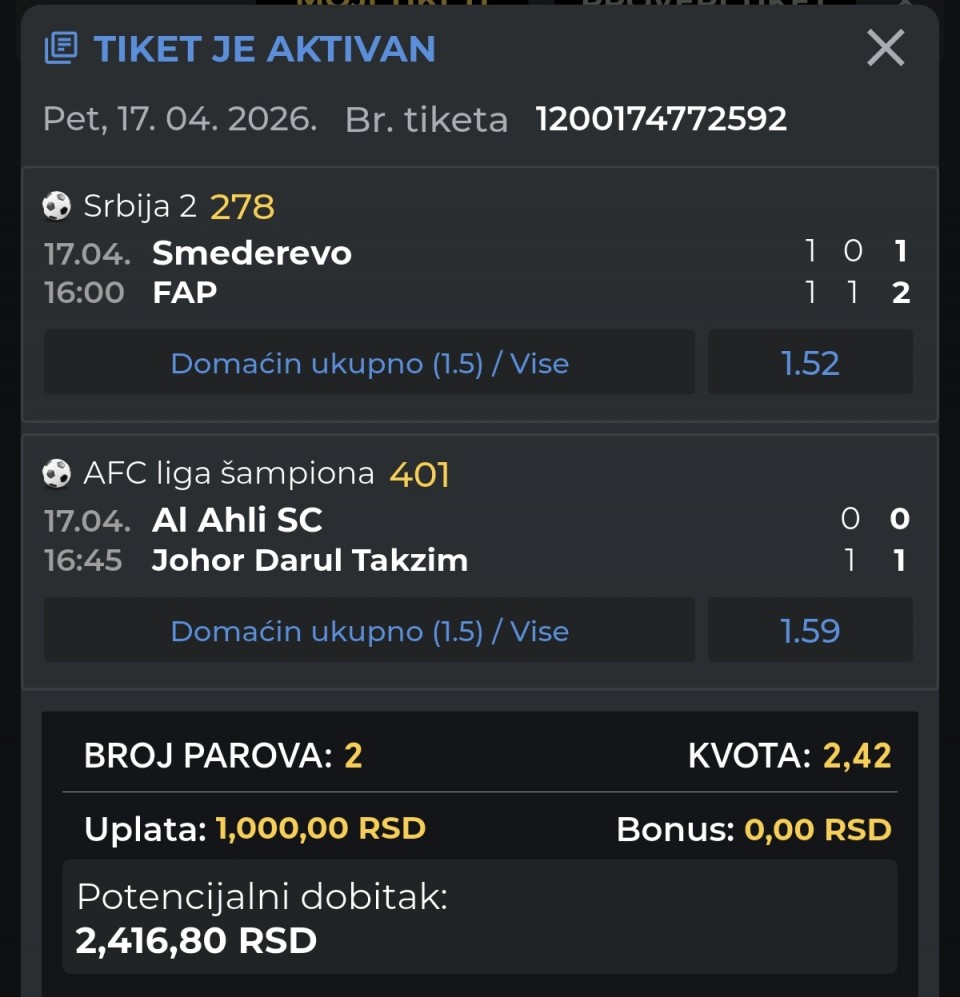 Tu je oko 9 kvota, vrlo prijatan tiket