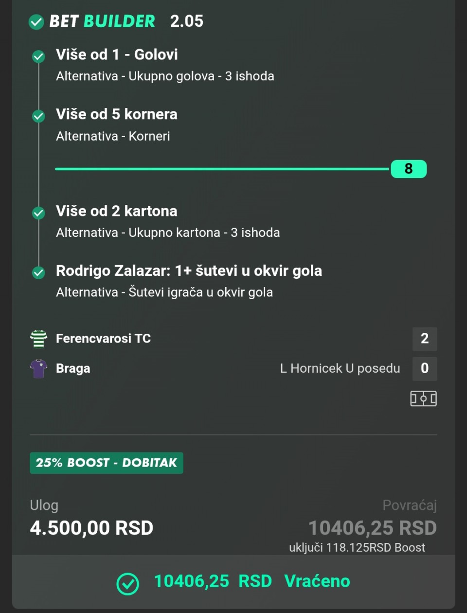I ono sto ce mnogima zaparati oči, a to je X2 na Sporting. Koliko god je to cudno, kvote na kladzi su me odlucile na taj korak. Naime, kako na ekipu koja pobjedi Atletiko, Inter (2×) i Mančester kući zaredom, može biti 2,45 kvota protiv Sportinga... razumijem ulog i sve, ali da im das samo 40% šansi za pobjedu, nešto mi to smrdi. I naravno, u prici sa par prijatelja, svi su vec to naglasili kao poklon dana, pa su se raspisali 1&3+ i ostale pizdarije, ovo zapravo bas zbog takvog javnog mišljenja, može biti kontra. Čak me nimalo ne bi iznenadilo da Bodo ispadne, jer ako gledamo koga su pobijedili sve, onda do finala mogu lagano, a to u fudbalu nije bas tako.