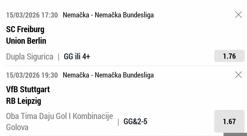 15.03.2026. 15:00h Crystal Palace - Leeds; tip: X; kvota: 3.25; uplata: 360,00 din.; isplata: 1.170,00 din.
