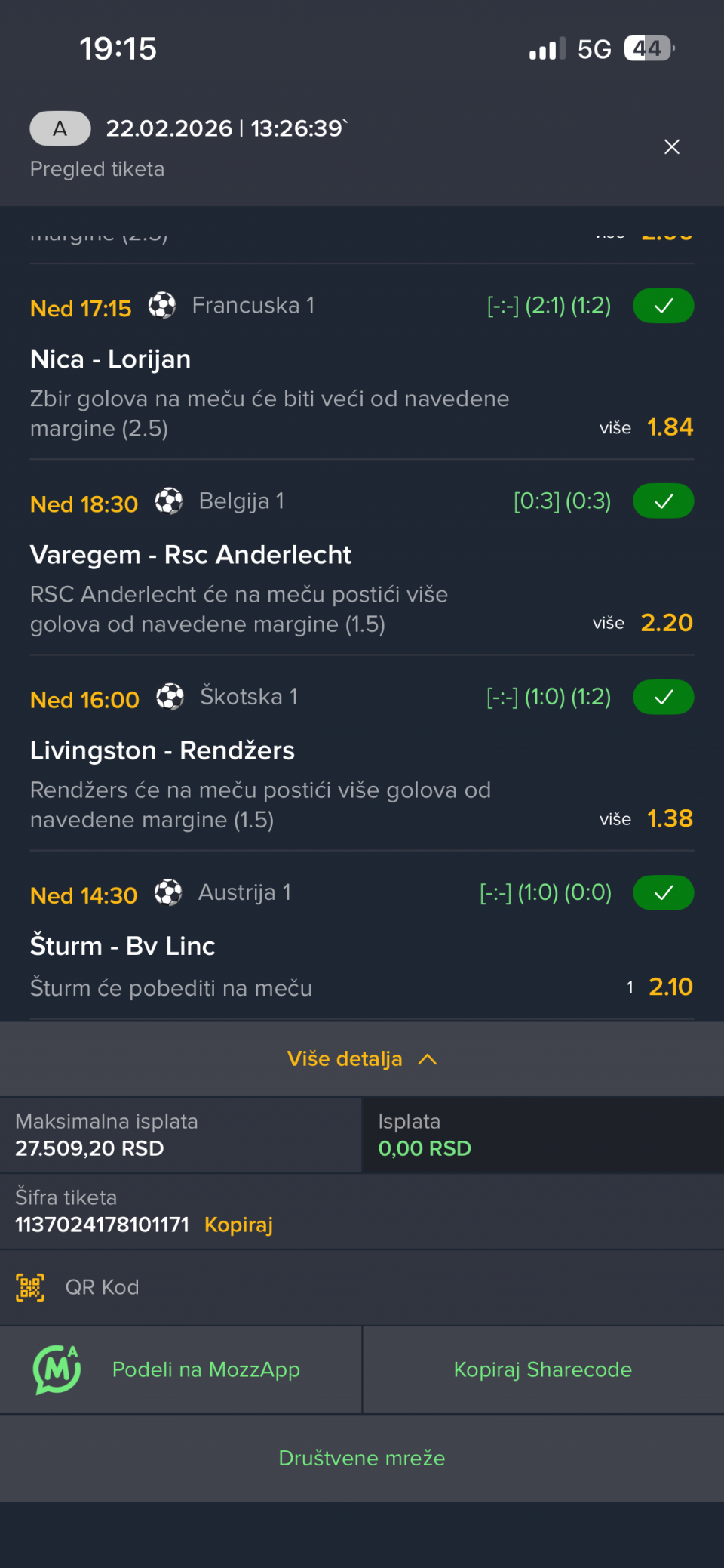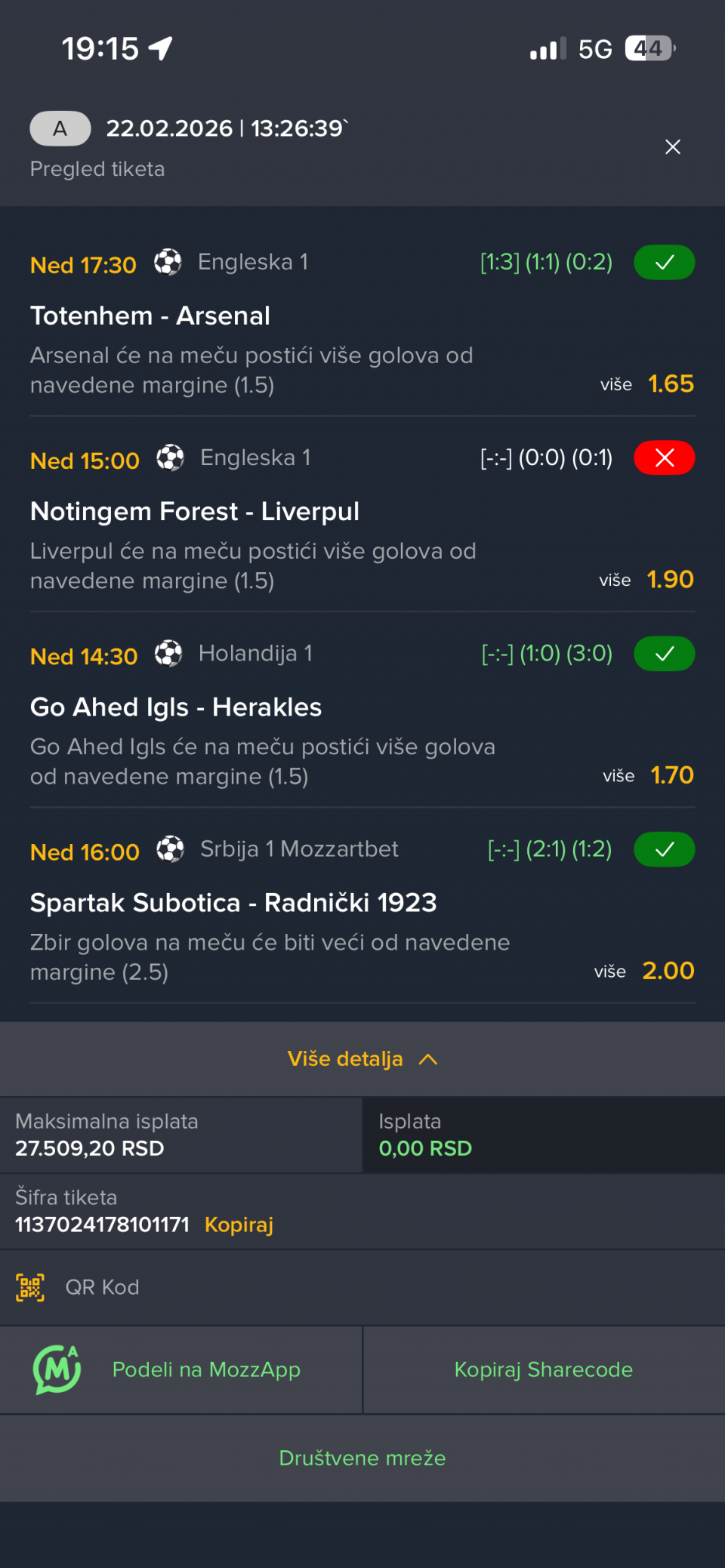 22.02. Kvota: 2.22 → drugi korak ❌