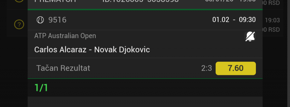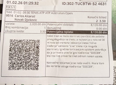 01.02.2026. 12:30h Torino - Lecce; tip: X; kvota: 3.10; uplata: 20.000,00 din.; isplata: 62.000,00 din.