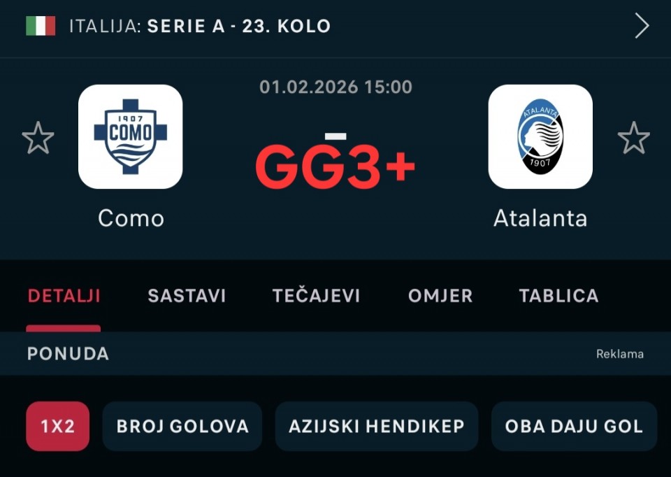 Como vs Atalanta - Atalanta je igrala 3 meca u 7 dana i ide u goste Comu koji je u dobroj formi i mislim da nemaju sirinu klupe da igraju na visokom nivou u kontinuitetu pa sam se odlucio za ovaj tip. Verujem i u kec.