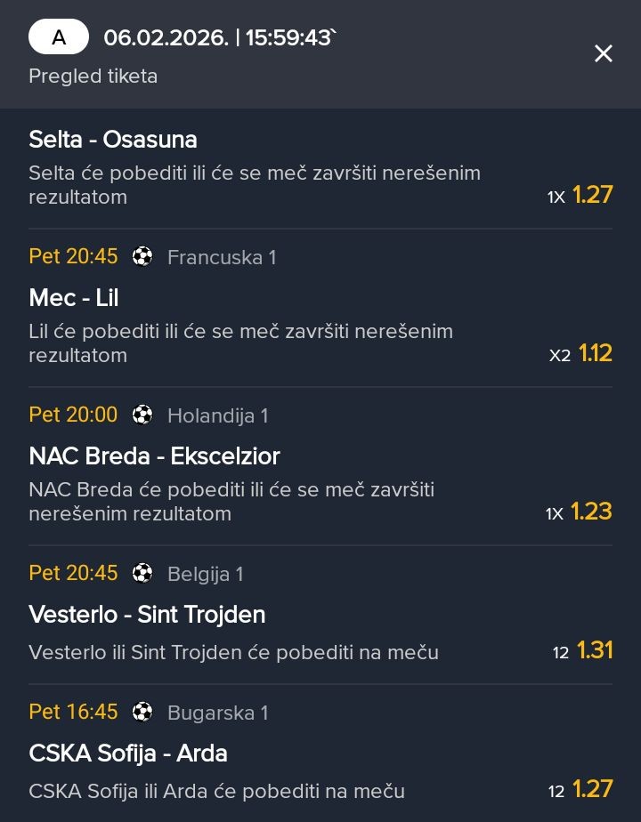 U poslednjih 9 dana Arsenal je igrao 4 meca, u poslednja dva nisu primili gol i bas zato jer je kvota prevelika i jer moze da bude gust mec, a moze da bude i 4:1, a i 1:1. Cisto zbog gustog rasporeda i po mom misljenju prevelike kvote igram ovo. Takodje, Arsenal ima svoje februarske momente da kiksne kod kuce protiv autsajdera