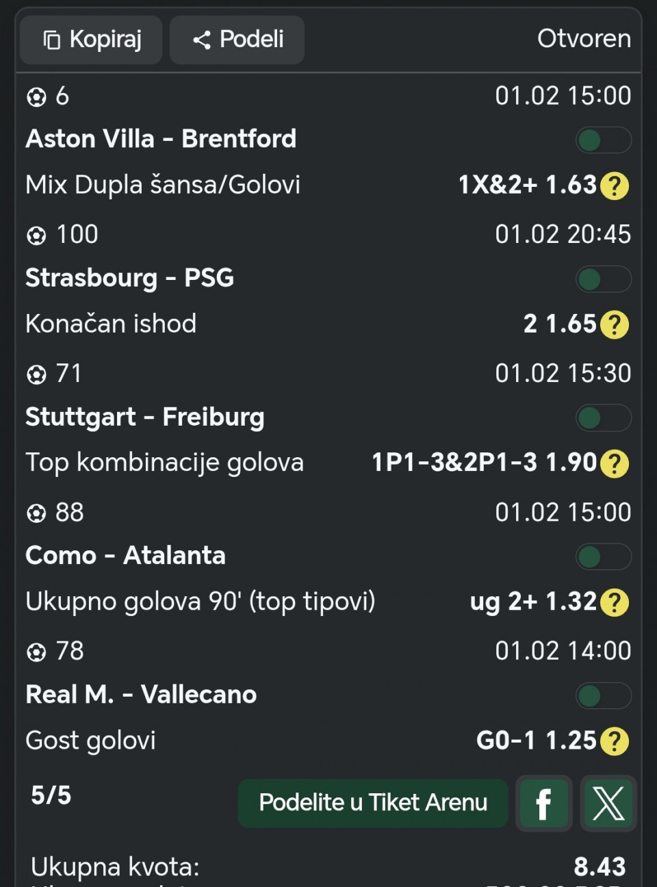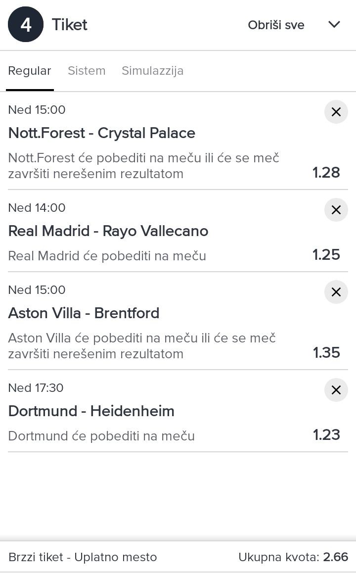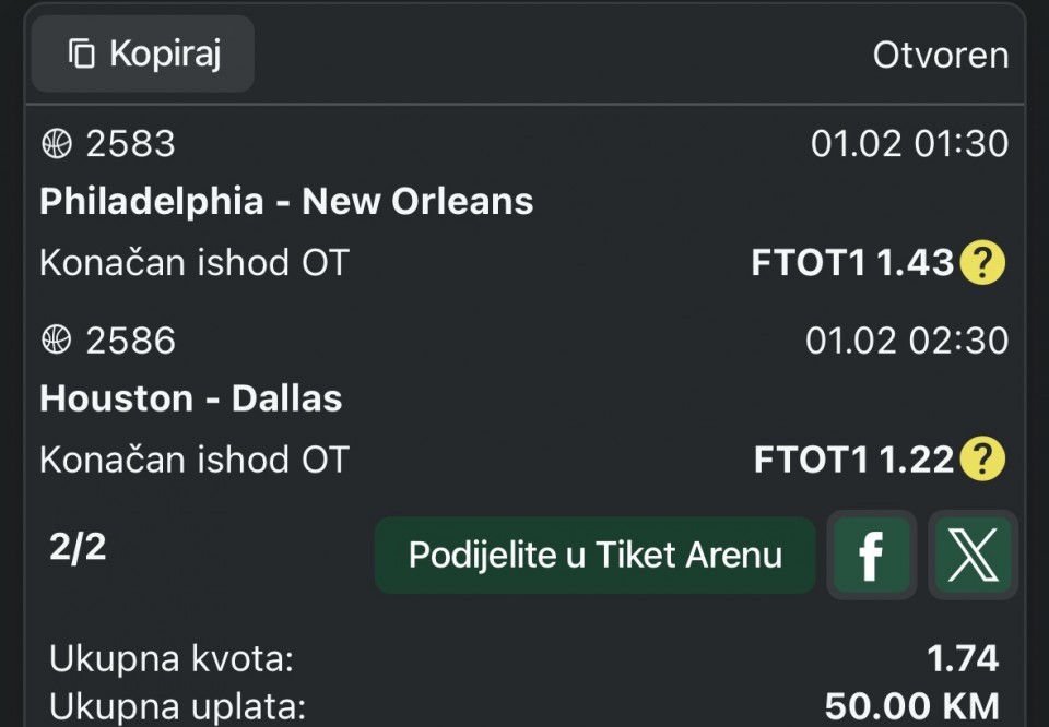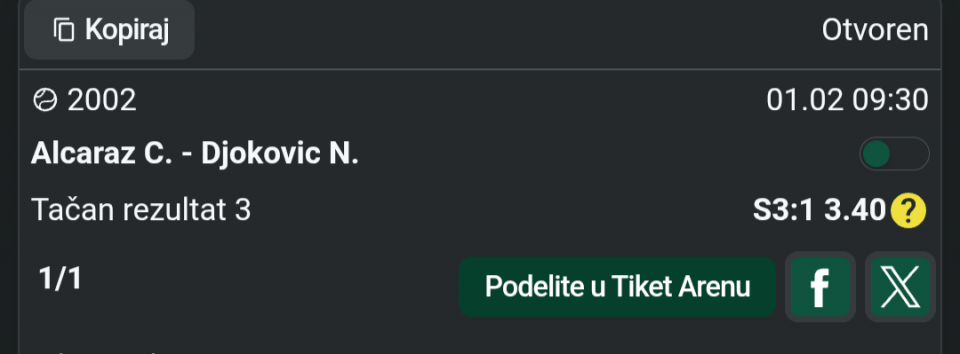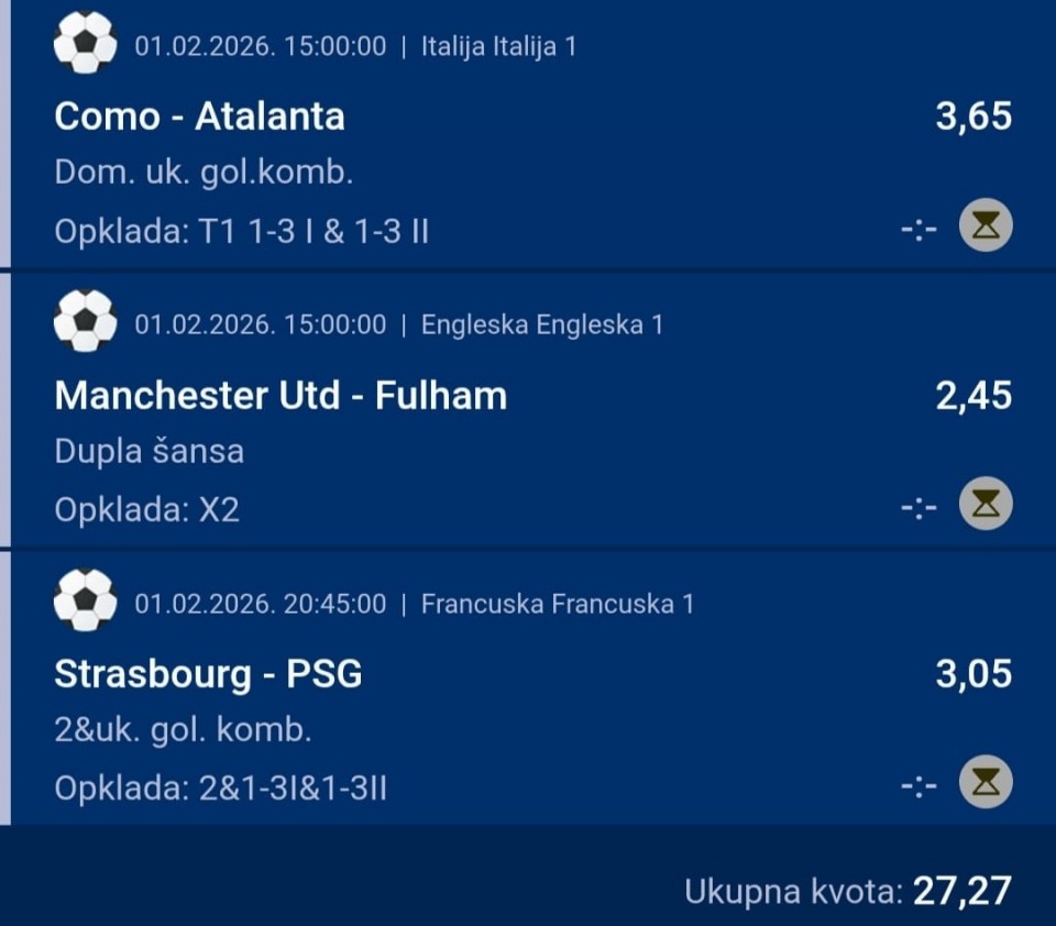 monte kristo Pogledaj moje ostale tikete i možeš pretpostaviti koliki je ulog...zbog ostalih članova nisam objavio ulog ,ne želim da neko ,zbog mog uloga, pomisli da je nešto 100% sigurno pa uplati tiket sa vecom sumom i onda da se žali i kuka ovde. Visina uloga ne odredjuje sigurnost. Srećno danas sa tiketima💥🍀🍀🍀 17 minutes ago