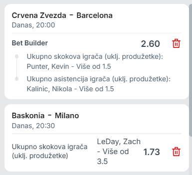 1. Kalinic 2 asistencije, samo u 3 od 13 meca ove sezone nije presao ovu granicu a veceras u derbiju sigurno da ce imati ogroman usage, i ocekujem malo vise loptu u rukama kod njega veceras, CMM me je takodje primamljivao sto se asistencija tice ali njega jos nemam u ponudi, na 4.5 i 5.5 bih ga uzeo sigurno, preko toga bih razmislio.
