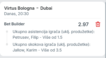 5. Karim 4 skoka, 4ka Bolonje u proseku igra 25 po utakmici, veceras bitan mec protiv Dubaia koji igra brzu kosarku s dosta suteva za 3, sto otvara naravno i koju sansu vise za skokove ukoliko naravno realizacija dubaija bude nesto realno, a ne da pogode sve, pa mi deluje realno veceras za njega da uhvati makar 4 skoka!