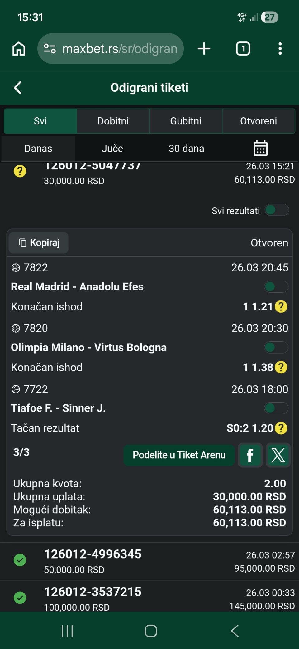 Danas laganije braco, cisto da se prati najsigurniji mi je kabengele pa cemo videti. Sutra ima strasnih utakmica, sve ce zivo da gori. Srecno😄