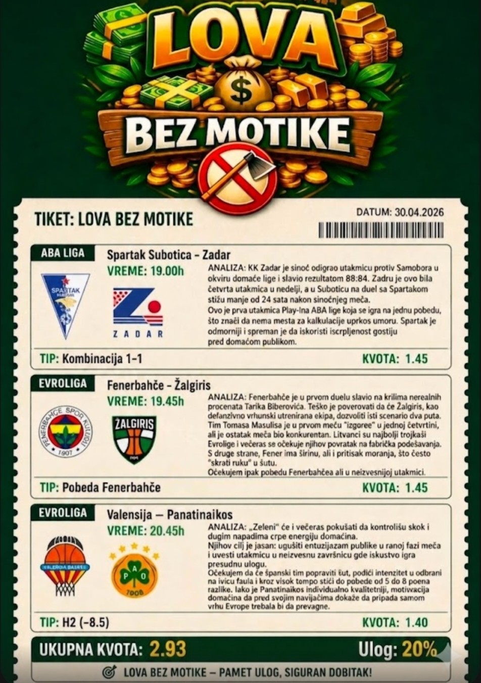 Danas igramo tiket kvota 2.90.