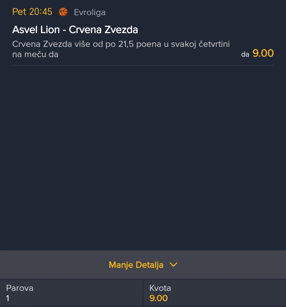 Rotterdam65 Lyon kod kuce bi trebao da ih odvali plus u evroligi nikad ne treba igrati na favorita. 3 minutes ago