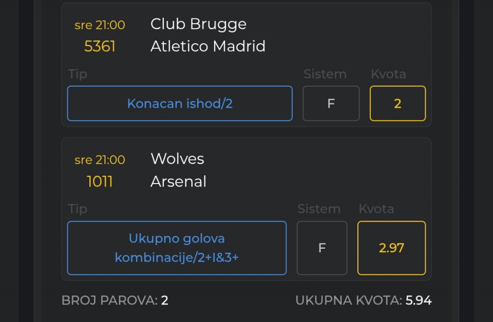 Atletiko igra toplo-hladno u poslednje vreme, ali ono što je bitnije jeste da igra daleko ofanzivnije u Evropi nego u prvenstvu - isto kao i kod Briža, na njihovim utakmicama u LŠ pada u proseku 4 gola - po mom mišljenju sasvim dovoljno za ovaj tip. Simeone je za vikend odmarao maltene čitavu sredinu i napad - nisu igrali Alvarez, Lookman, Ljorente, Koke ni Grizman (samo neki od nabrojanih su odigrali po pola sata), što će reći da ovoj utakmici pridaje dosta pažnje i ne verujem da će samo da se brani. Samo jedan od prethodna 4 H2H duela u novijoj istoriji se završio ovim tipom, ali ovaj Atletiko nije taj od pre 3 i 7 godina - igra daleko ofanzivnije, a odbrana mu je daleko slabija na strani nego na svom terenu - 10 primljenih golova u 4 utakmice. To će svakako pokušati da iskoristi Briž, koji ne čeka na svom terenu već napada i vrši pritisak od samog starta. Postojala je i opcija za Briž DI1+ & D2+, i iako Briž daje dosta golova u prvom, Atletiko više prima u drugom, pa je ta opcija otpala...