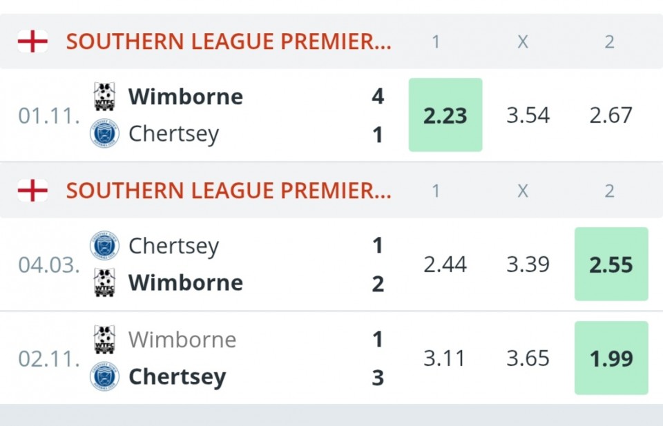 Dva za Wiboutne i jedan za Chertsey. Ovakav h2h skoro nisam video, gde su sve tri bile veliki prelazi . Pre neko kola sam dobio bas prelaz na Wimbourne,tako da cu vise fotsirati na 1. Srecno.