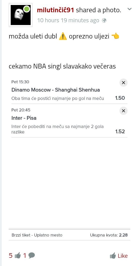 Malo da se pohvalim u ova dva dana u dva dana 460 e na uloženi 30 eura....pa ko ima kakav predlog savjet za utakmice javite se pa cemo skupa malo statistiku razraditi😉