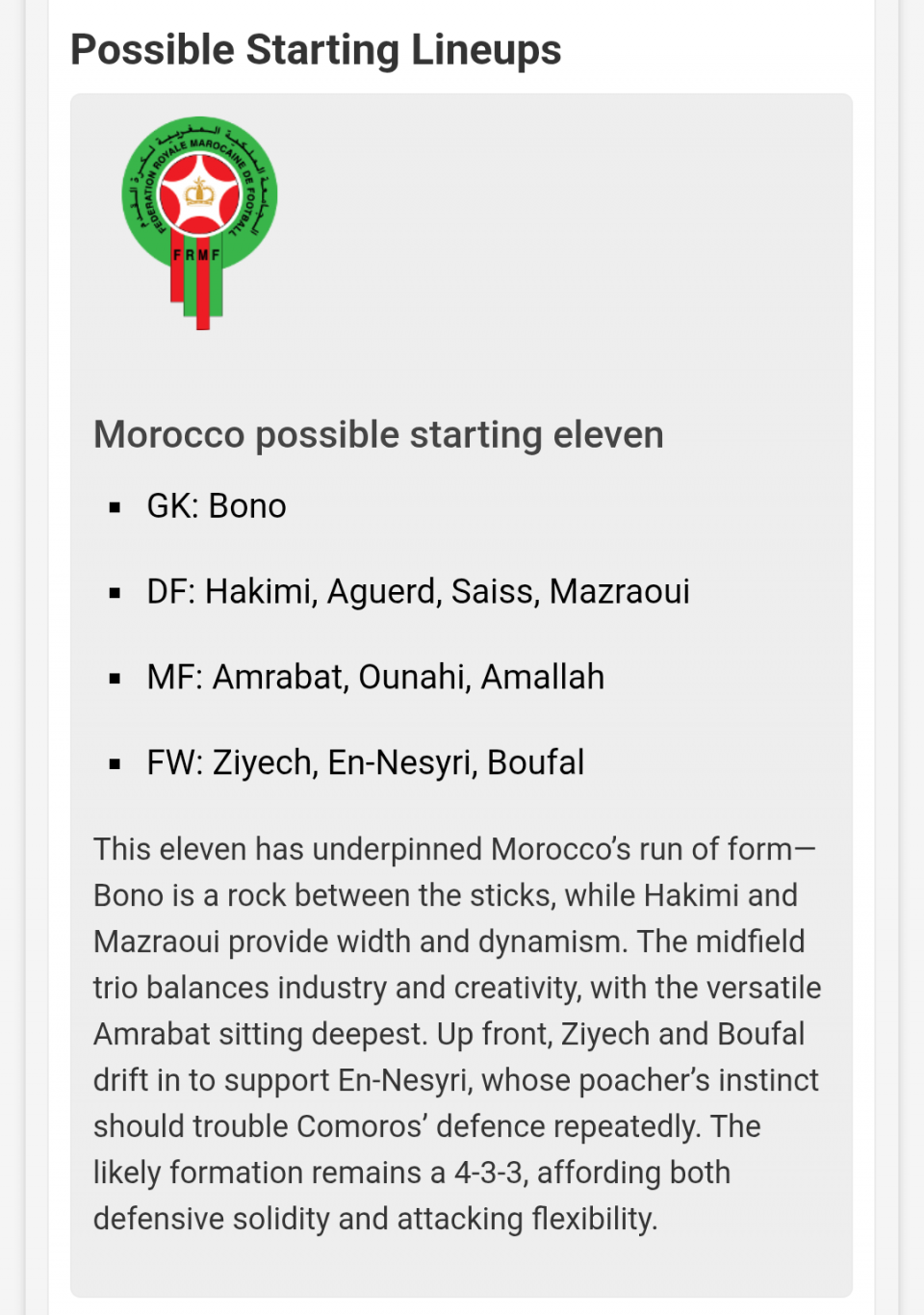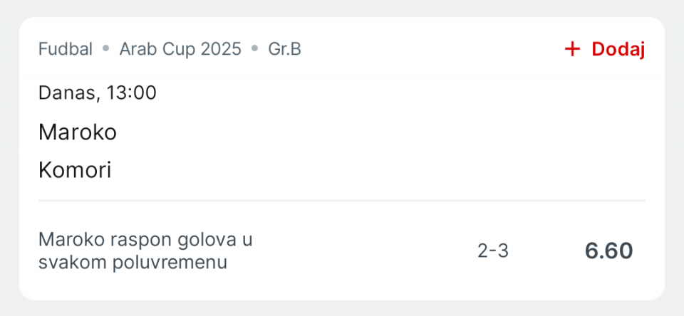 Arab cup,igra se u Bergenu u Norveškoj,Maroko jak kao beton ako izađu u ovom ili sličnom sastavu po meni mogu lako da postignu 4,5 golova,ja igram da daju bar po 2 u svakom poluvremenu,nadam se brzom pogotku koji će otvoriti meč,sretno ko prati!