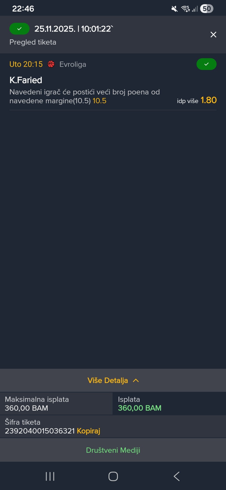Vratio se nakon duzeg izostanka i odigrao odlicnu utakmicu, prosek mu je negde na 14 ove sezone sto se poena tice Asistencije oko 3 tako da bi trebalo da udje bez problema ocekujem...Evo nesto i od mene kada se vec predlaze NBA.