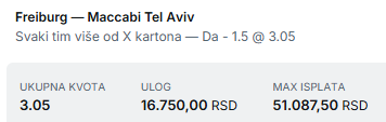 I na kraju tribine i navijači. Frajburgovi navijači su rekli da će bojkotovati meč, jer su im iz vlasti zabranili banere, transparente, zastave i sl. Ista je situacija bila i protiv Štugarta, ali su tada npr viđeni navijači Makabija kako imaju svoje zastave i uzvikivaju raznorazne rasističke i druge uvrede. Tako da opet imamo nemačko-izraelski duel i dvostruke aršine, pa da vidimo mogu li se eventualne tenzije na tribinama preneti i na teren. Ista kvota je bila i na 5+ kartona, ali podaci su bolji za ovaj tip jer se baš dosta mečeva ova dva tima završilo podelom kartona od 2:2 na kraju, čemu se nadam da će i ovde sudija biti "pravedan" i da će pokušati da "ne ošteti" nijedan tim i tako smiri strasti podelom istog broja kartona...