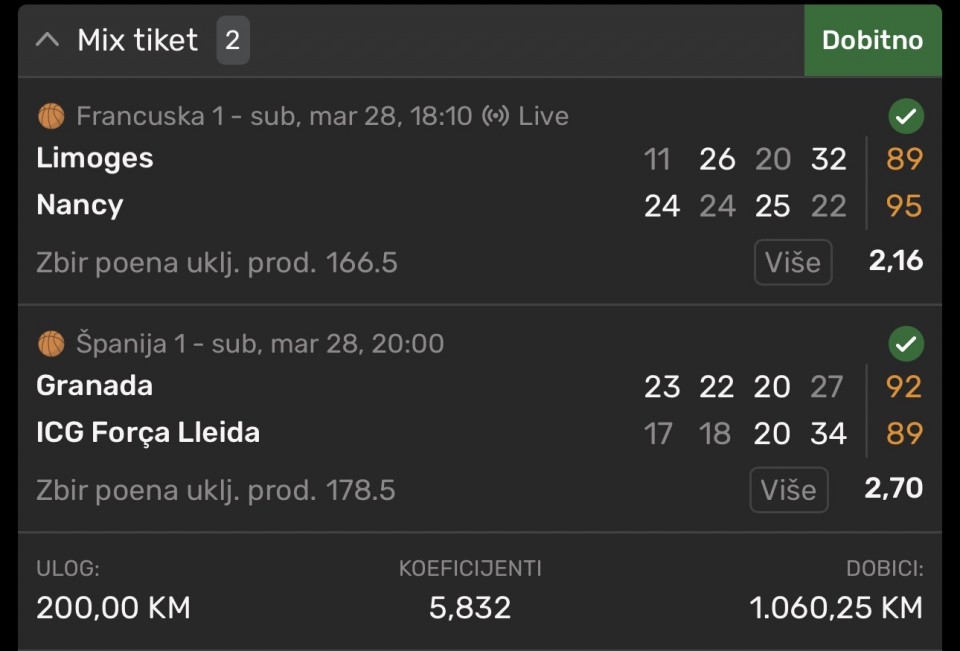 Danasnji listic 25 od 31 pogodjenih parova, Englezi su se dobro poskidali, mada je Port Vale primio gol na kraju utakmice skoro. Splading i MK da nisu mogli gola dati najjace ekipe u svojim ligama skoro.. Rukomet tri pada jako lose, a pogotovo sam...Danasnji listic 25 od 31 pogodjenih parova, Englezi su se dobro poskidali, mada je Port Vale primio gol na kraju utakmice skoro. Splading i MK da nisu mogli gola dati najjace ekipe u svojim ligama skoro.. Rukomet tri pada jako lose, a pogotovo sam se oko sva tri dvoumio sta odigrati i menjao konacne odluke.