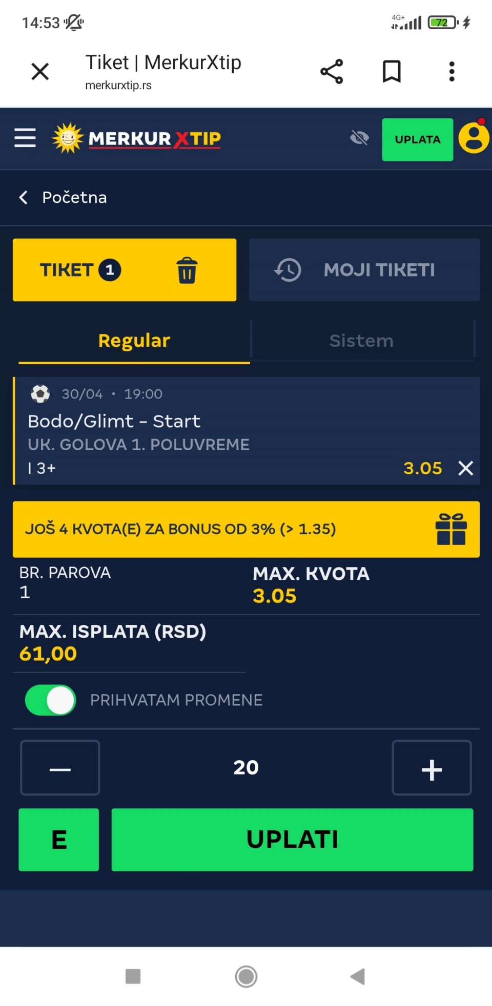 Pozdravi. Evo nešto što sam igrao za danas na Mozzartu (Bhplay). Ako se nekome nešto sviđa neka probere i oprezno sa ulogom, samo minimala jer sam primjetio da je narasla kvota na Omanski Muscat u gostima, gdje sam igrao čistu 2, kao što se da...Pozdravi. Evo nešto što sam igrao za danas na Mozzartu (Bhplay). Ako se nekome nešto sviđa neka probere i oprezno sa ulogom, samo minimala jer sam primjetio da je narasla kvota na Omanski Muscat u gostima, gdje sam igrao čistu 2, kao što se da vidjeti. Sretno ako neko nešto probere jer i nije baš neka ponuda danas. Show more